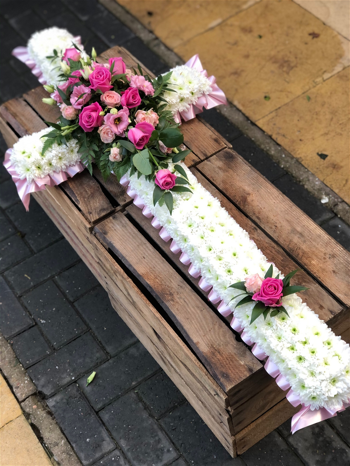 A beautiful based cross,  with pink ribbon edging with white chrysanthemum base and a corsage to match your colour choice.