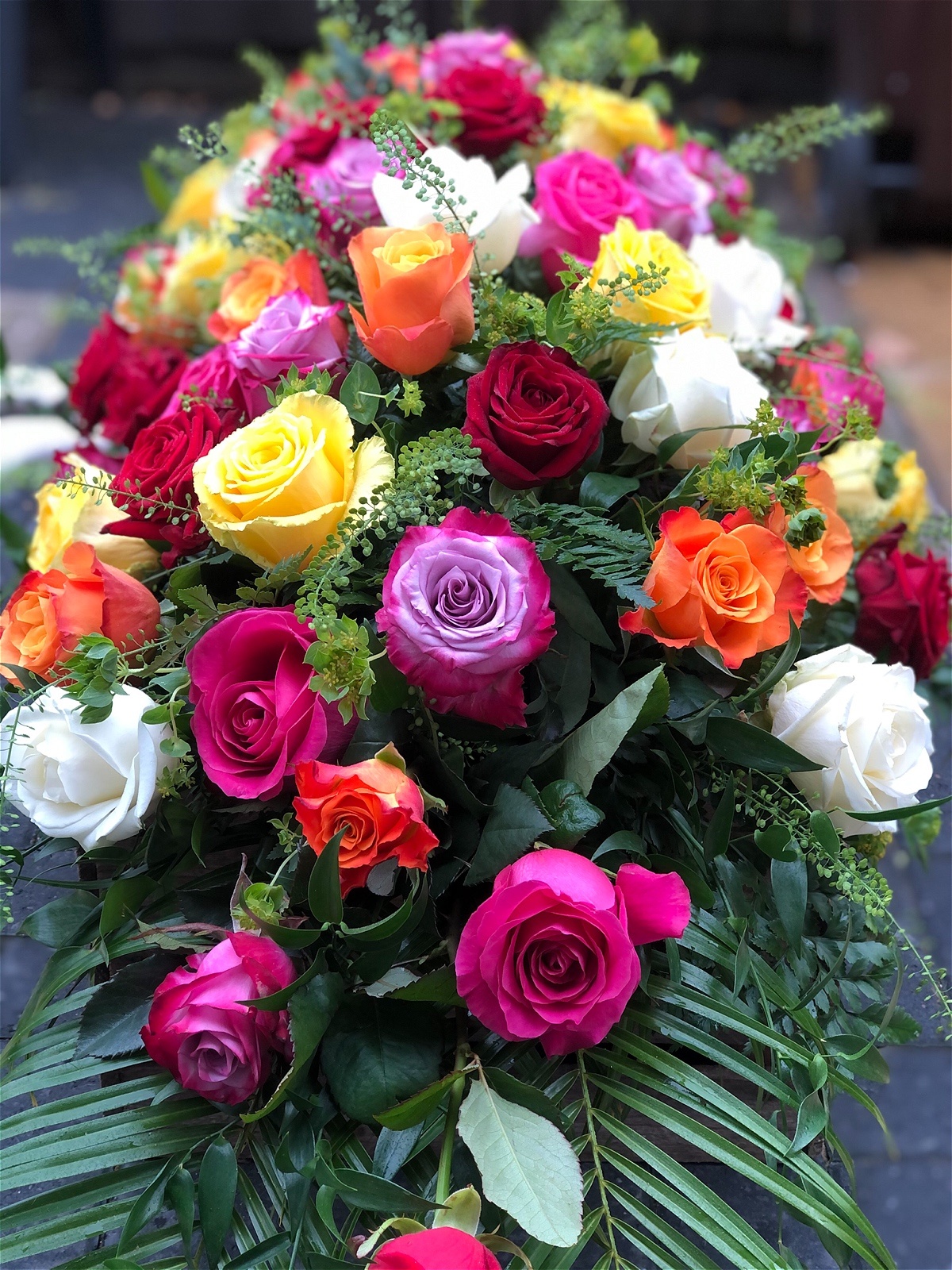 A beautiful Spray created with a selection of colored Roses, sit perfectly alongside variegated lime Dracaena, Aralia leaves, Cocculus and salal