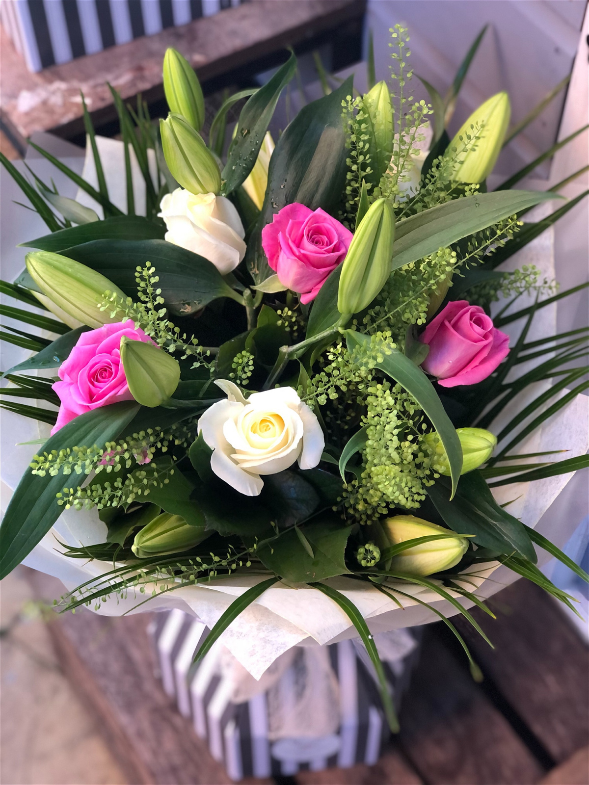 A beautiful and stunningly scented hand tied bouquet, using the best white avalanche roses and oriental scented Lily, together with thlaspi, palm and seasonal foliage's, a real show stopper and a sure way to brighten someones special day.