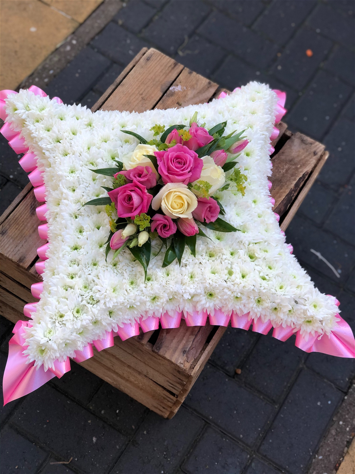 A beautiful white and red Traditional Based Cushion. Double Chrysanthemums, Red & White Roses sit perfectly alongside variegated china grass and lime foliage's, finished with a pleated ribbon edging.