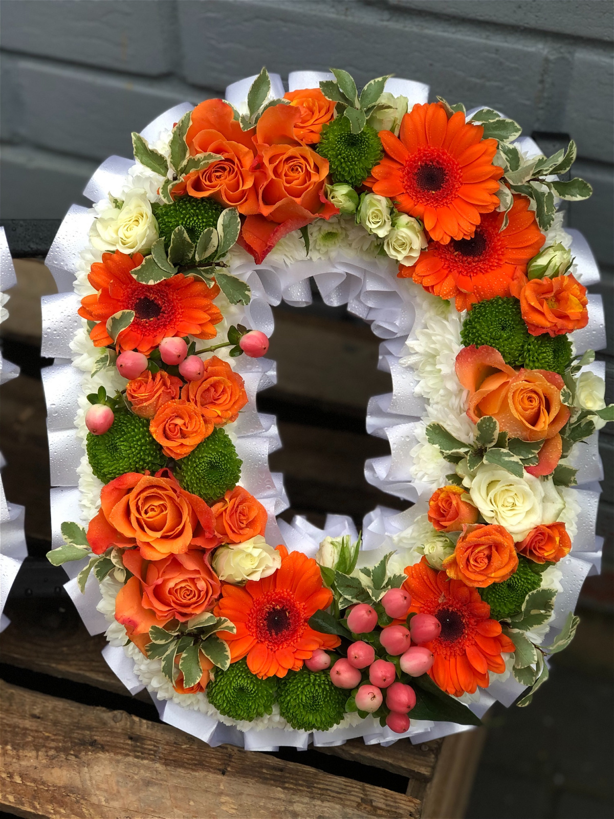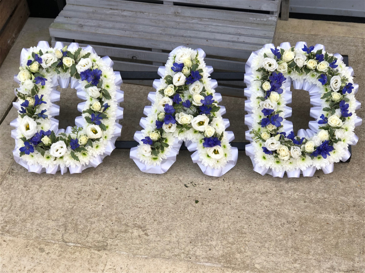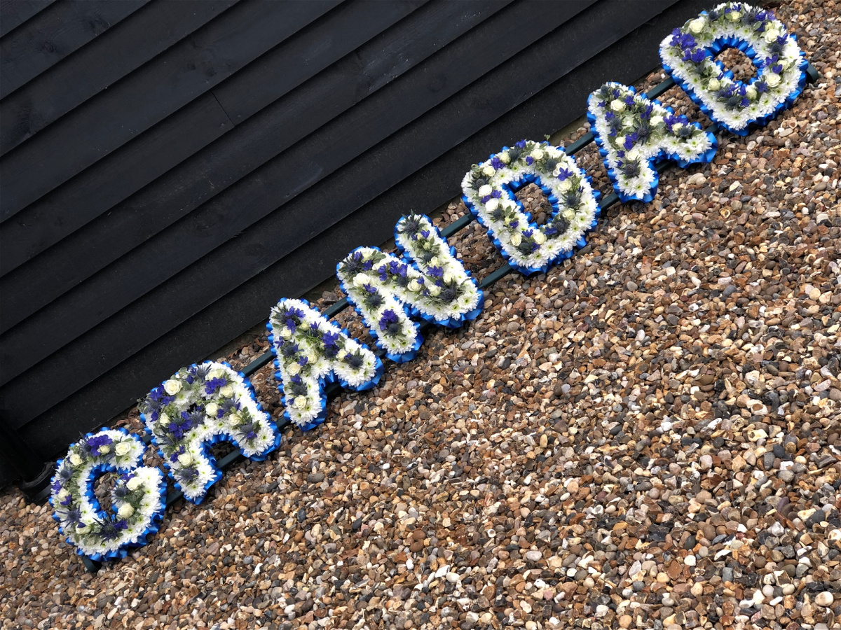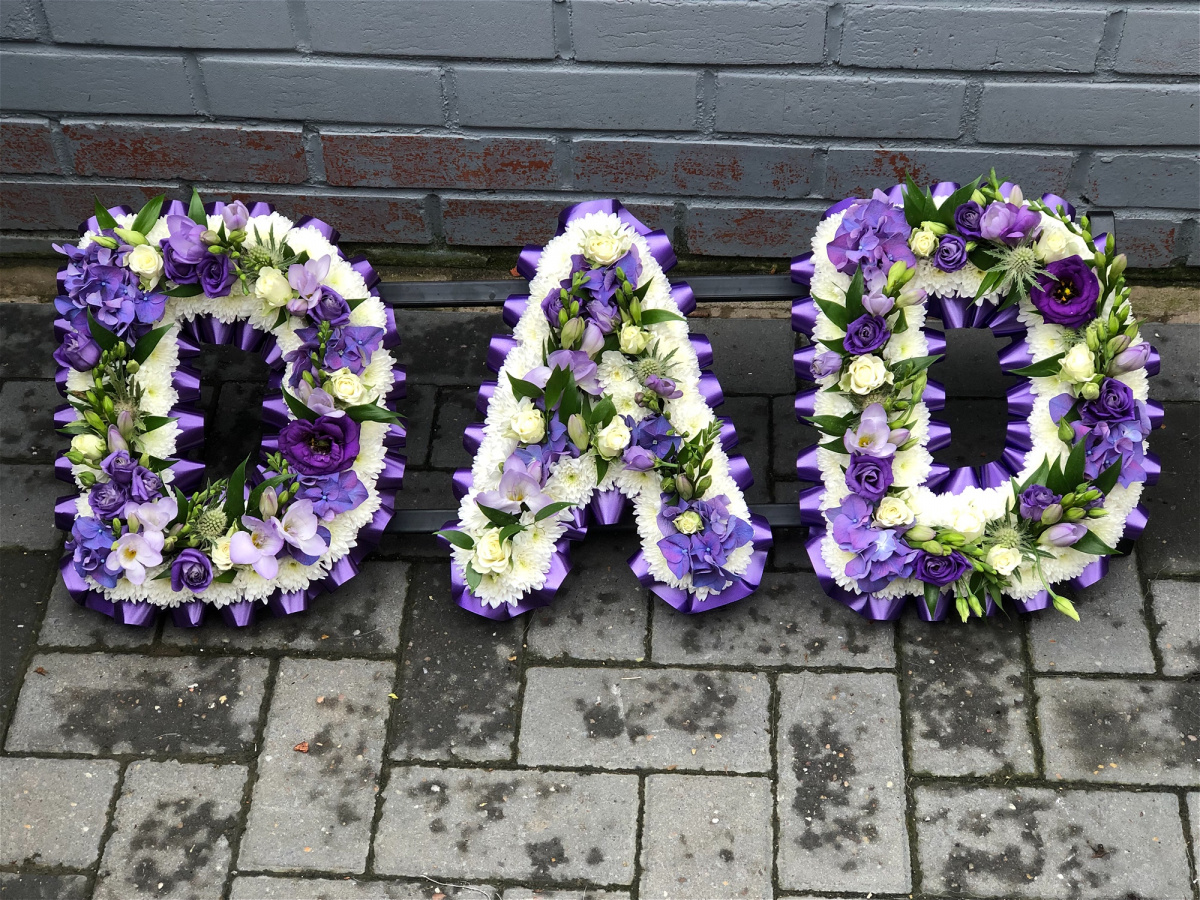 Lettering has a ribbon edging and a white border with mix flowers to match through the centre, a twist on the classic letter tributes.