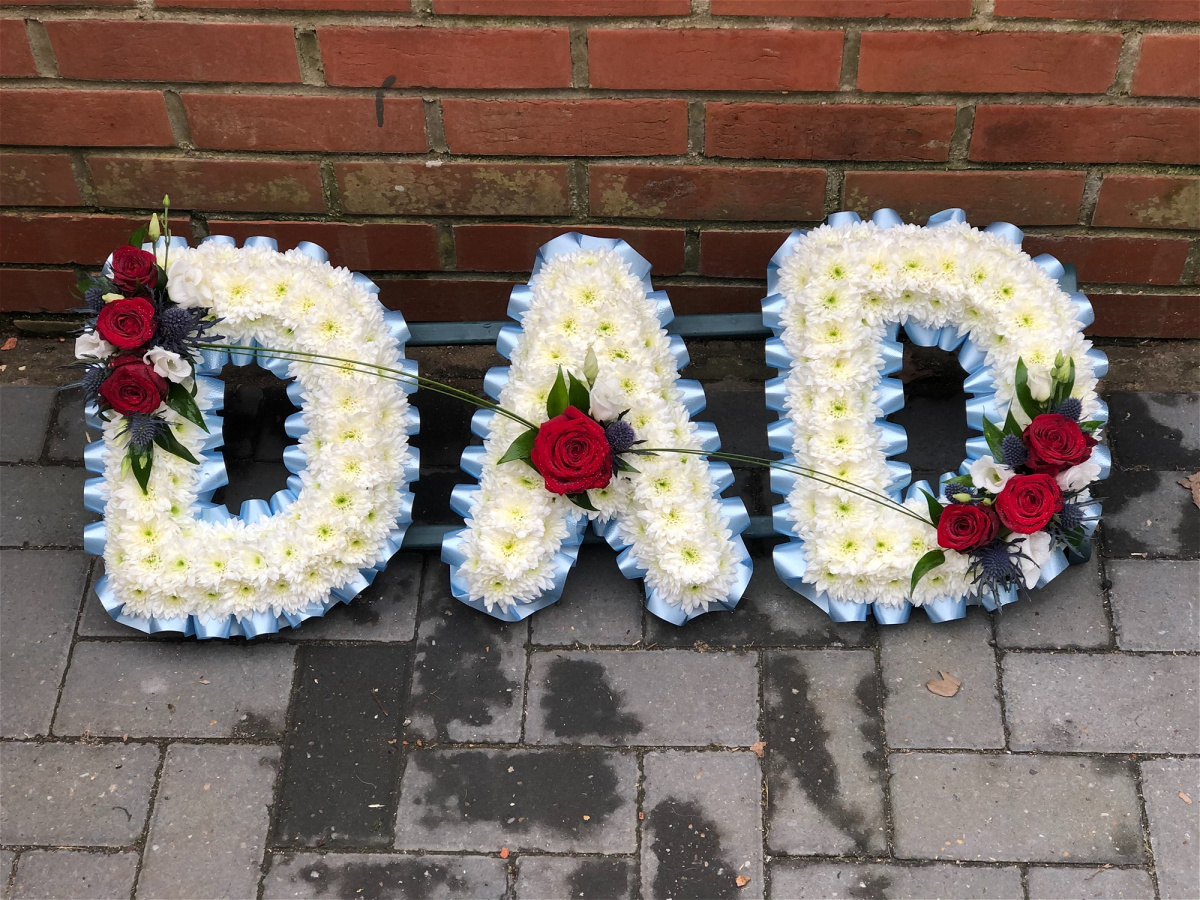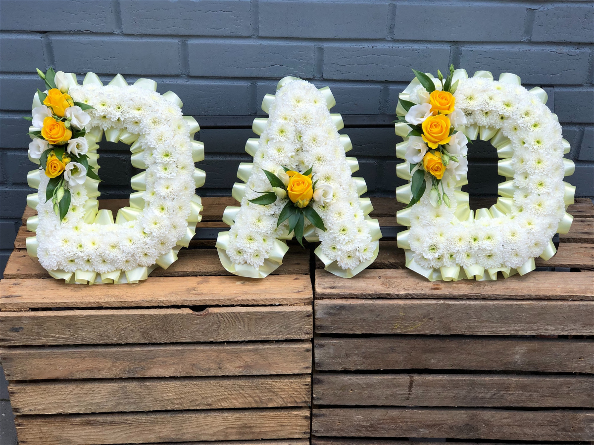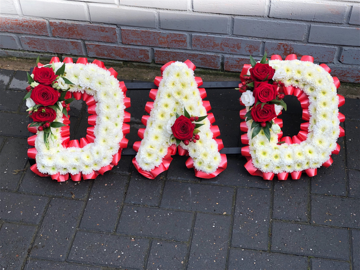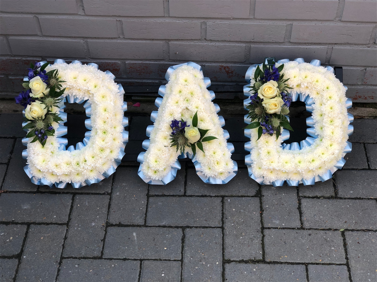 Beautiful white Chrysanthemums with a flourish of floral to match your ribbon choice edged with ribbon pleats, form the name DAD.