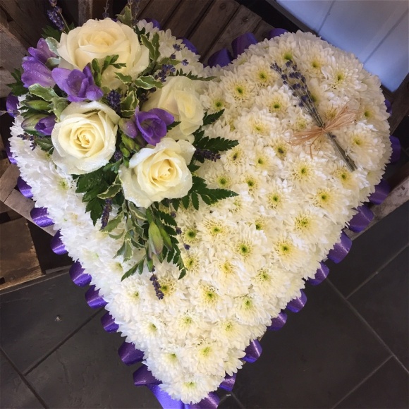A based heart with a stunning corsage of white roses and lilac lizzy, with a touch is scented lavender.