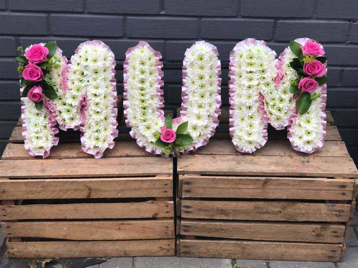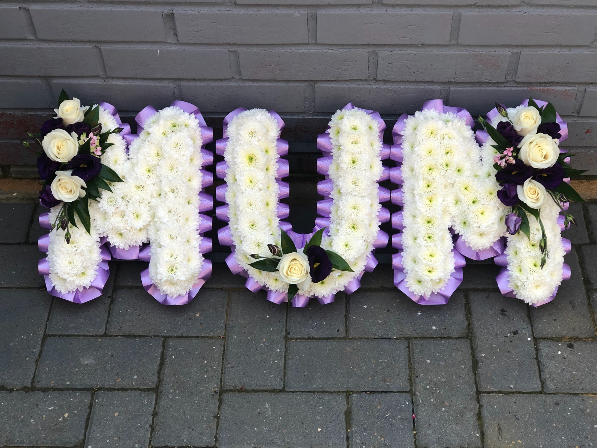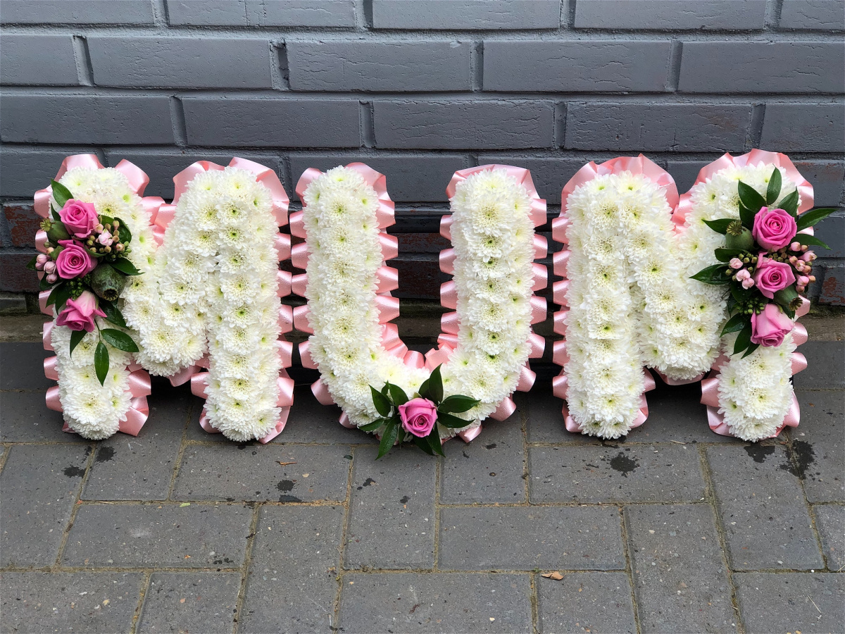 Beautiful white Chrysanthemums with a flourish of florals, edged with ribbon pleats, form the name MUM.