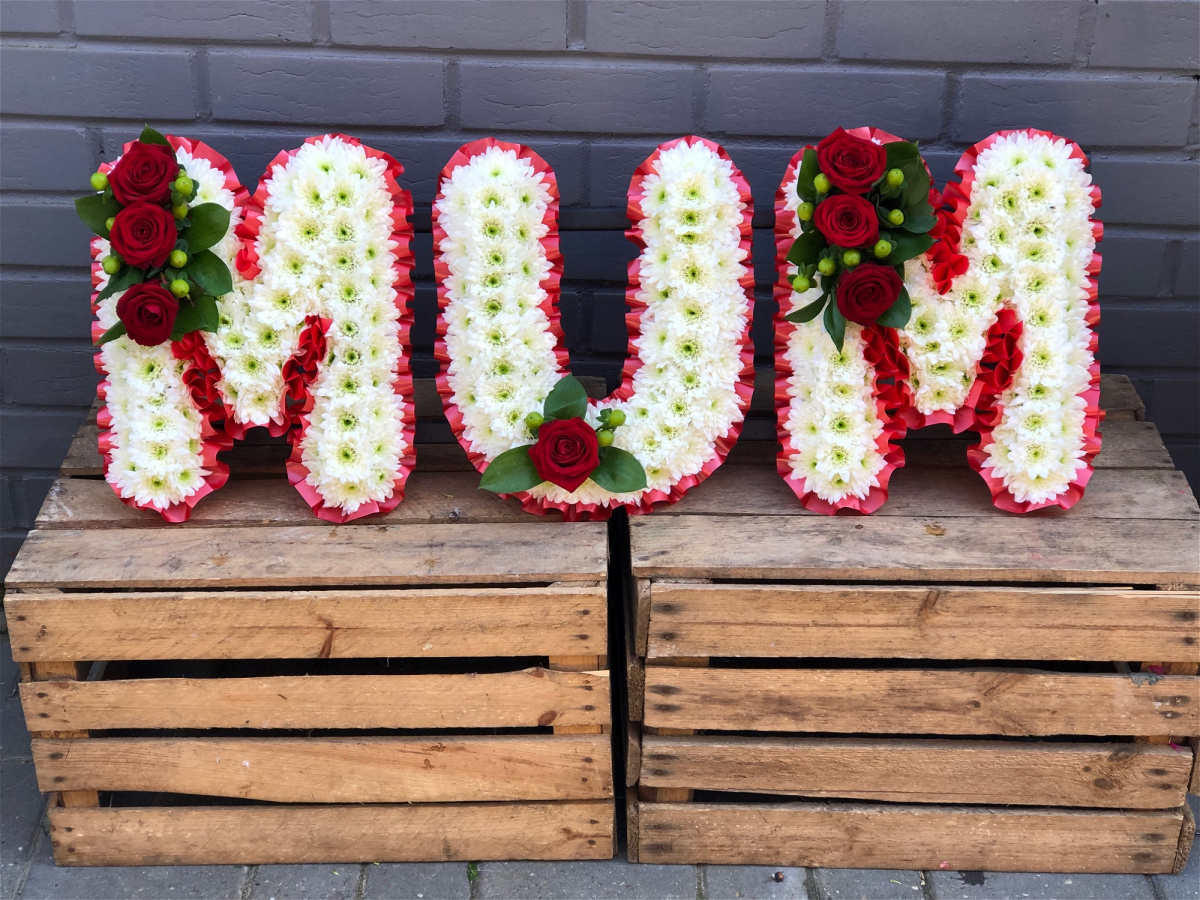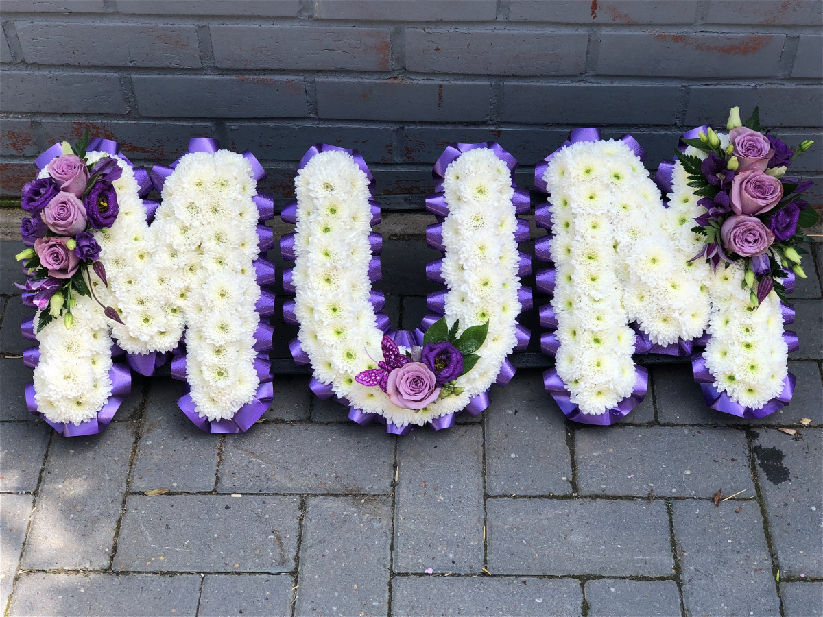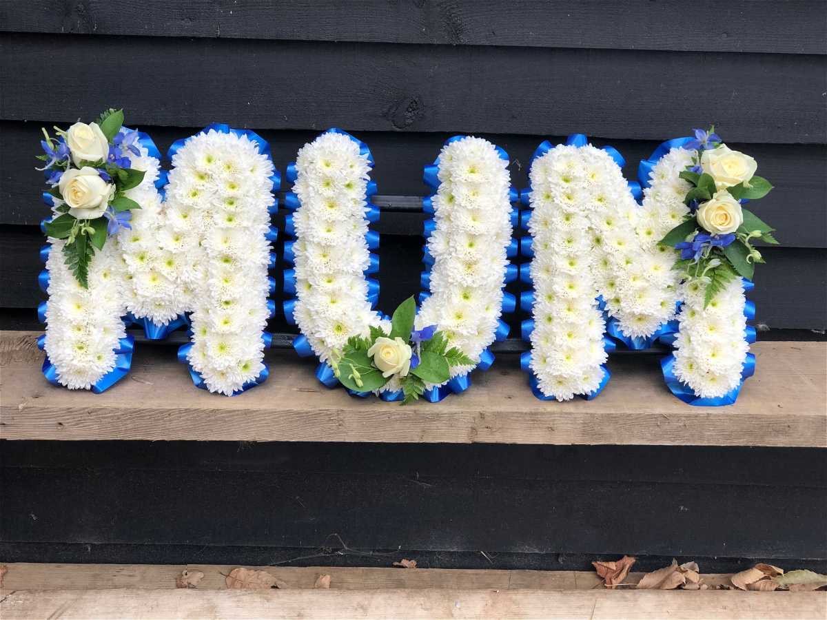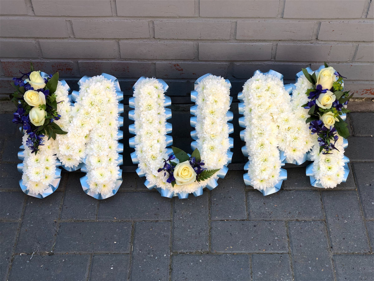 Beautiful white Chrysanthemums with a flourish of florals, edged with ribbon pleats, form the name MUM.