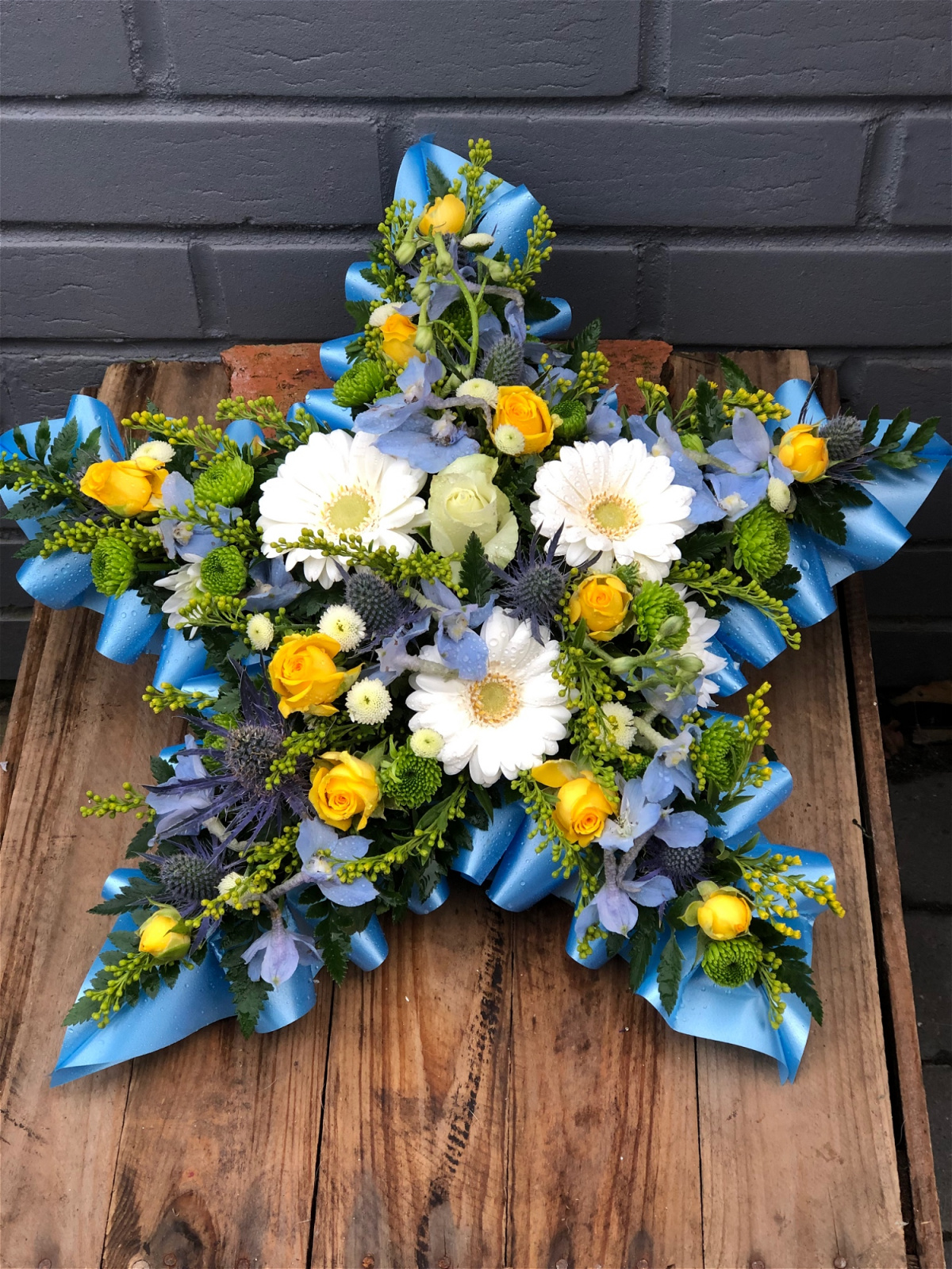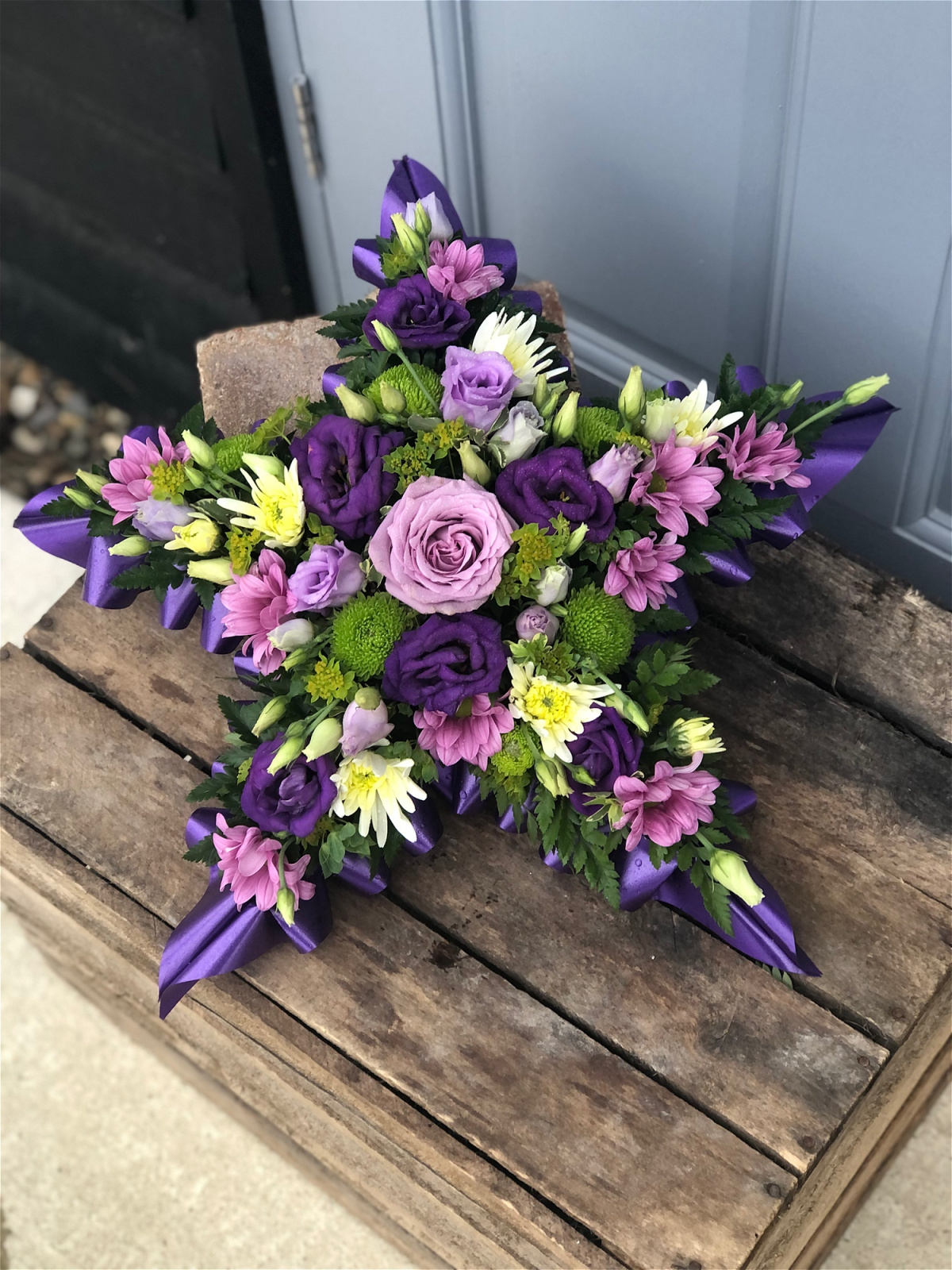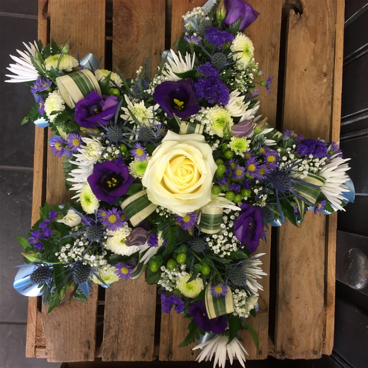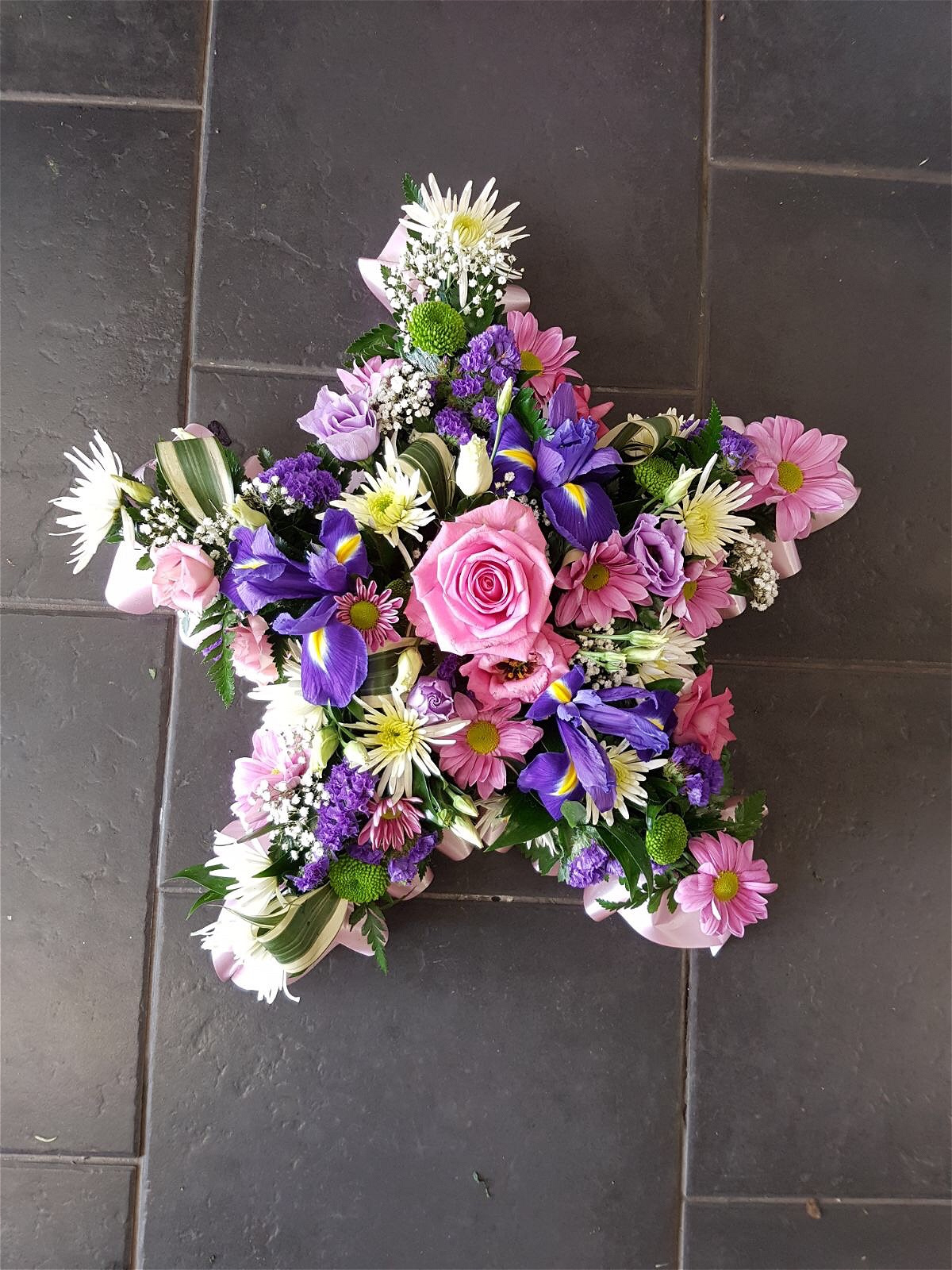 A beautiful pink & cream Star Tribute. Roses, Chrysanthemums, Iris and alstromeria sit perfectly alongside variegated and lime Dracaena, Astilbee , Cocculus, Salal and Gypsophlia.
