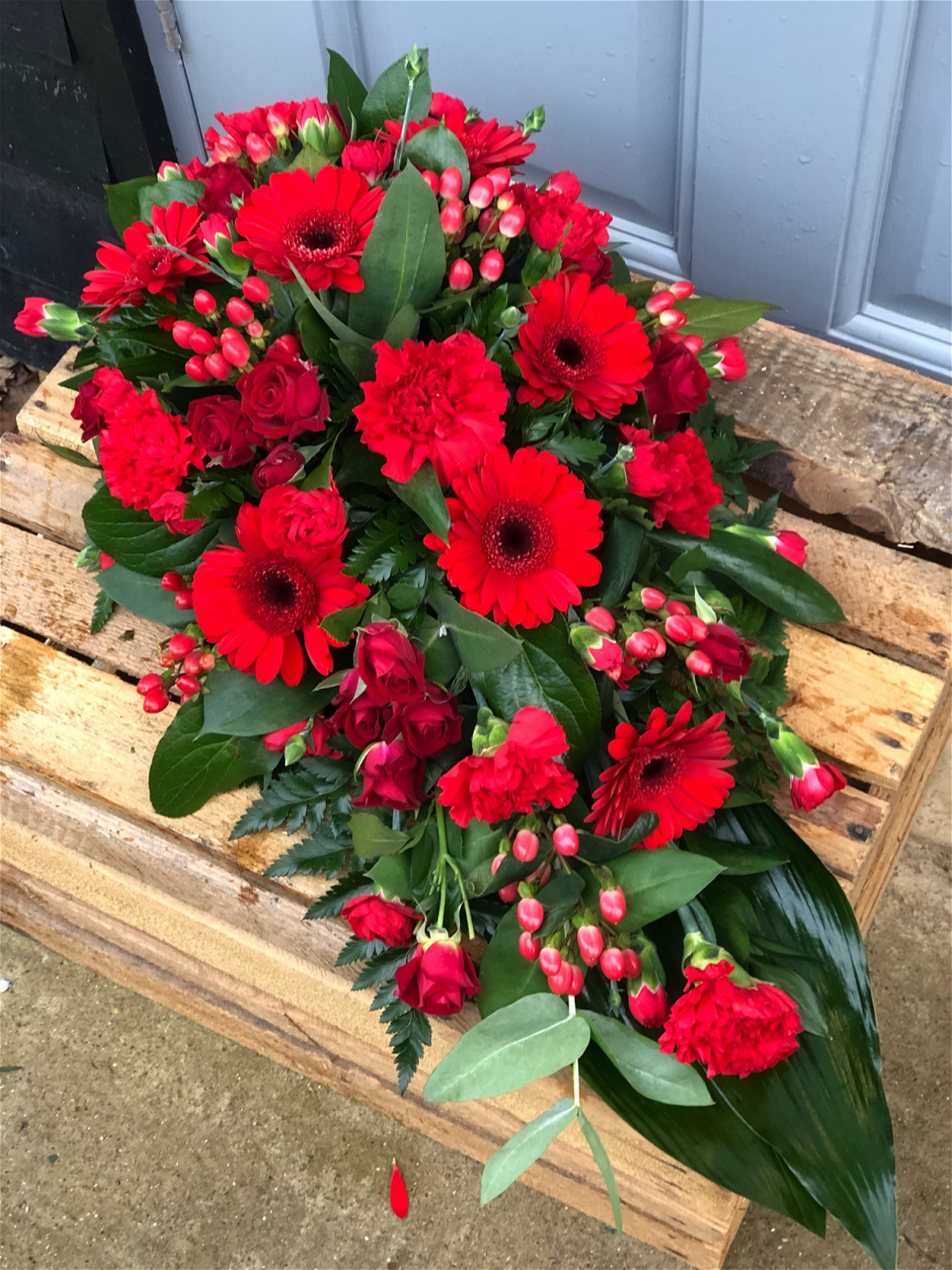 Seasonal selection of red blooms, in a teardrop spray tribute.