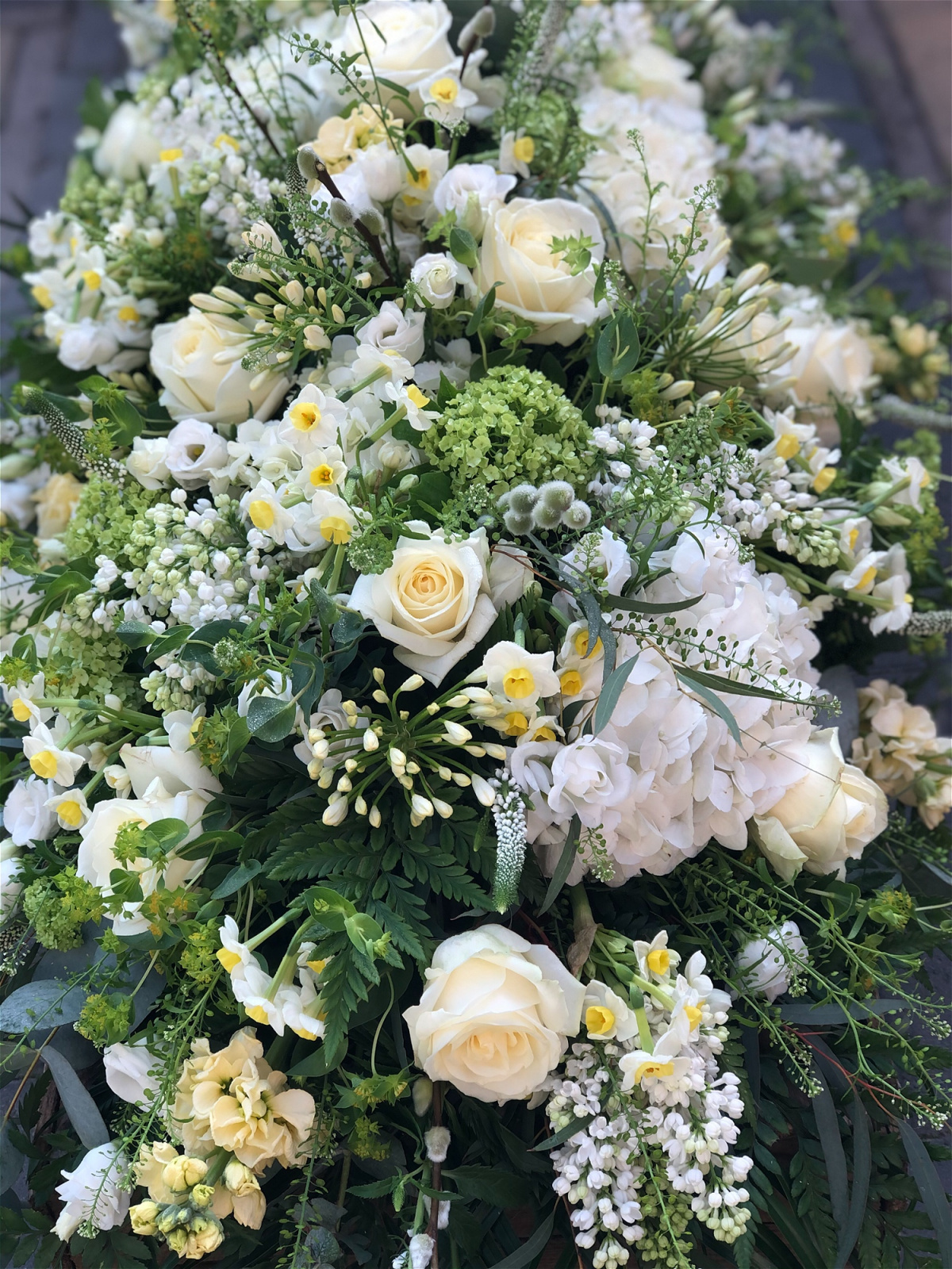Beautiful wild rustic style full casket spray, with hydrangea, white Avalance Roses and a selection of the finest seasonal flowers to compliment. A truly beautiful tribute for your loved one.