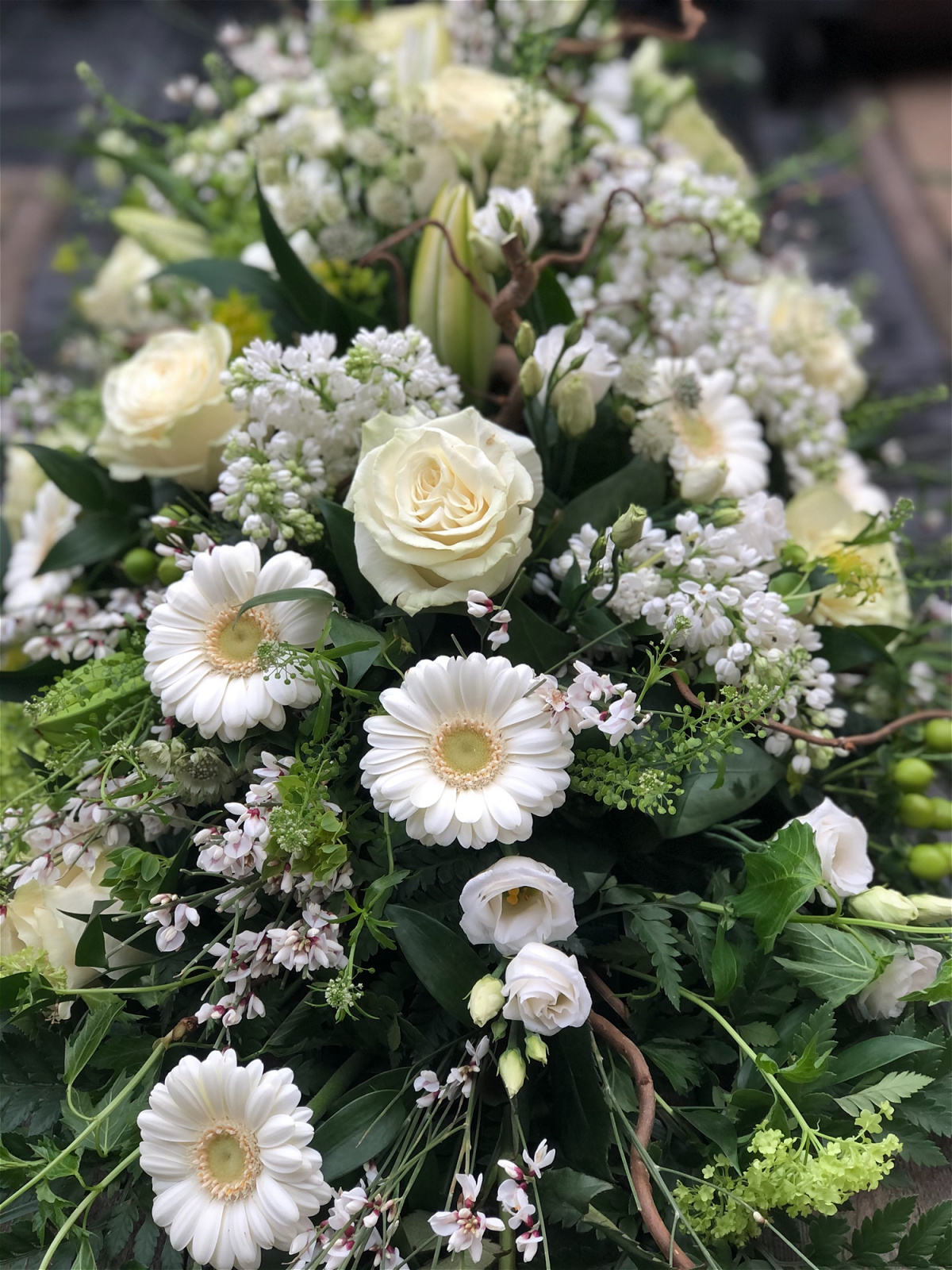 Beautiful woodland style full casket spray, with white Avalanche roses, white Germini, contorted Hazel and a selection of the finest seasonal flowers to compliment. A truly beautiful tribute for your loved one.