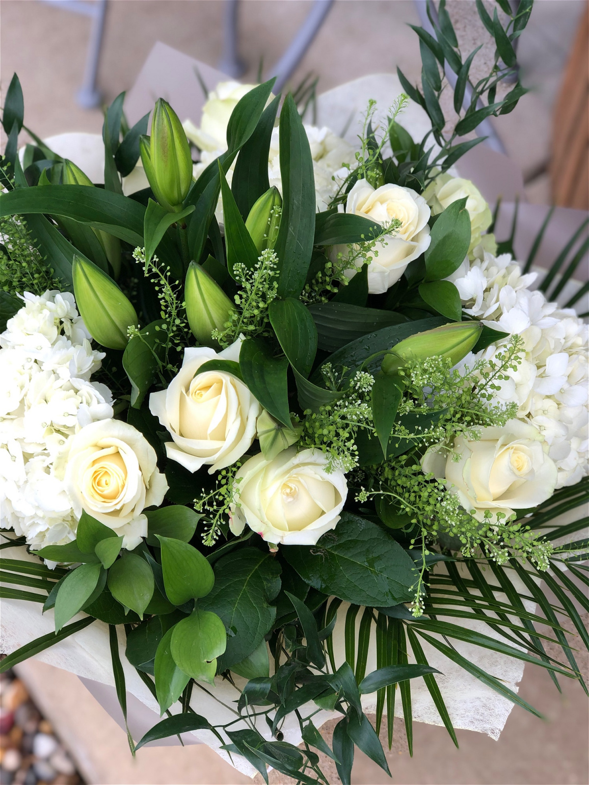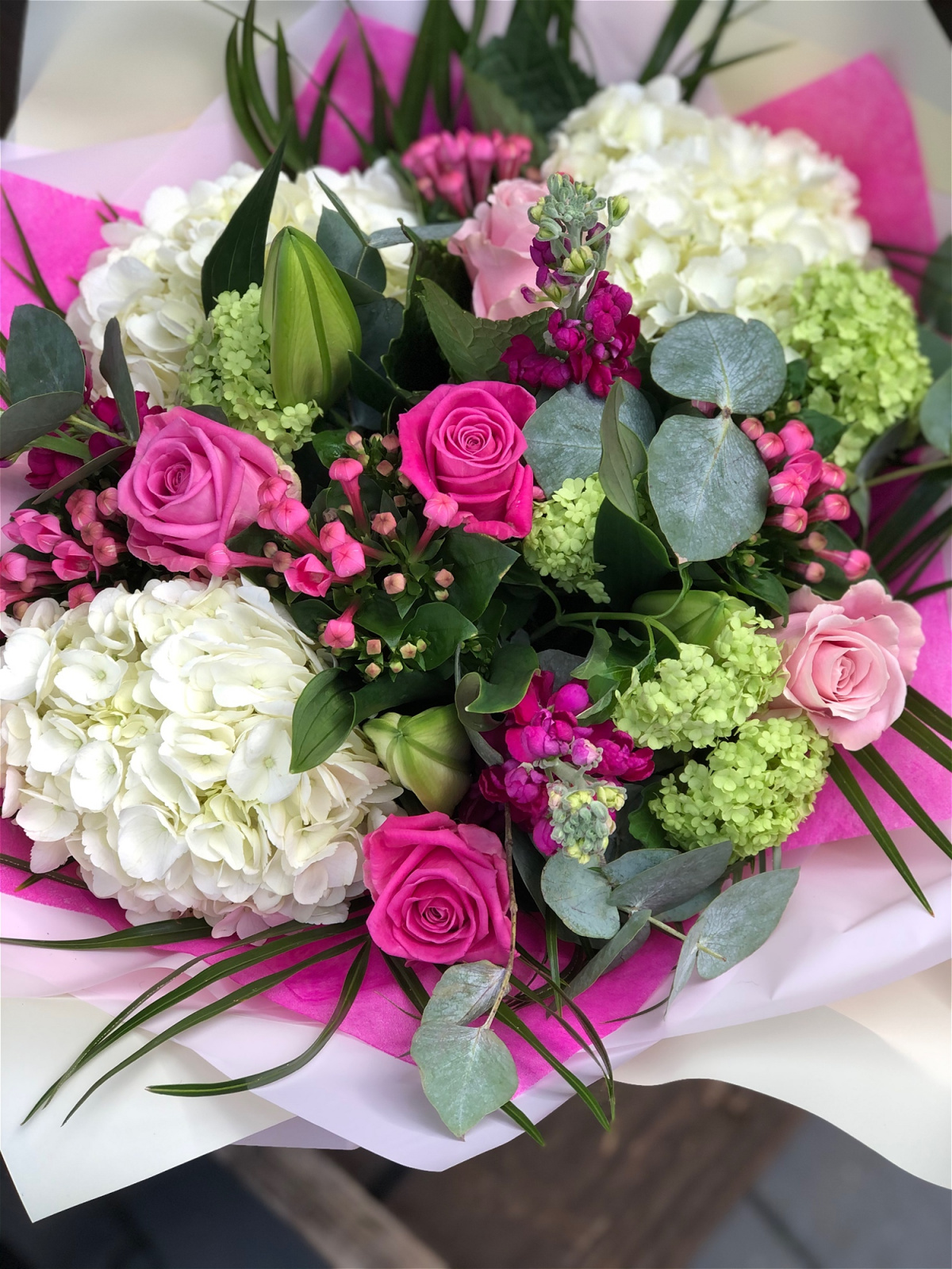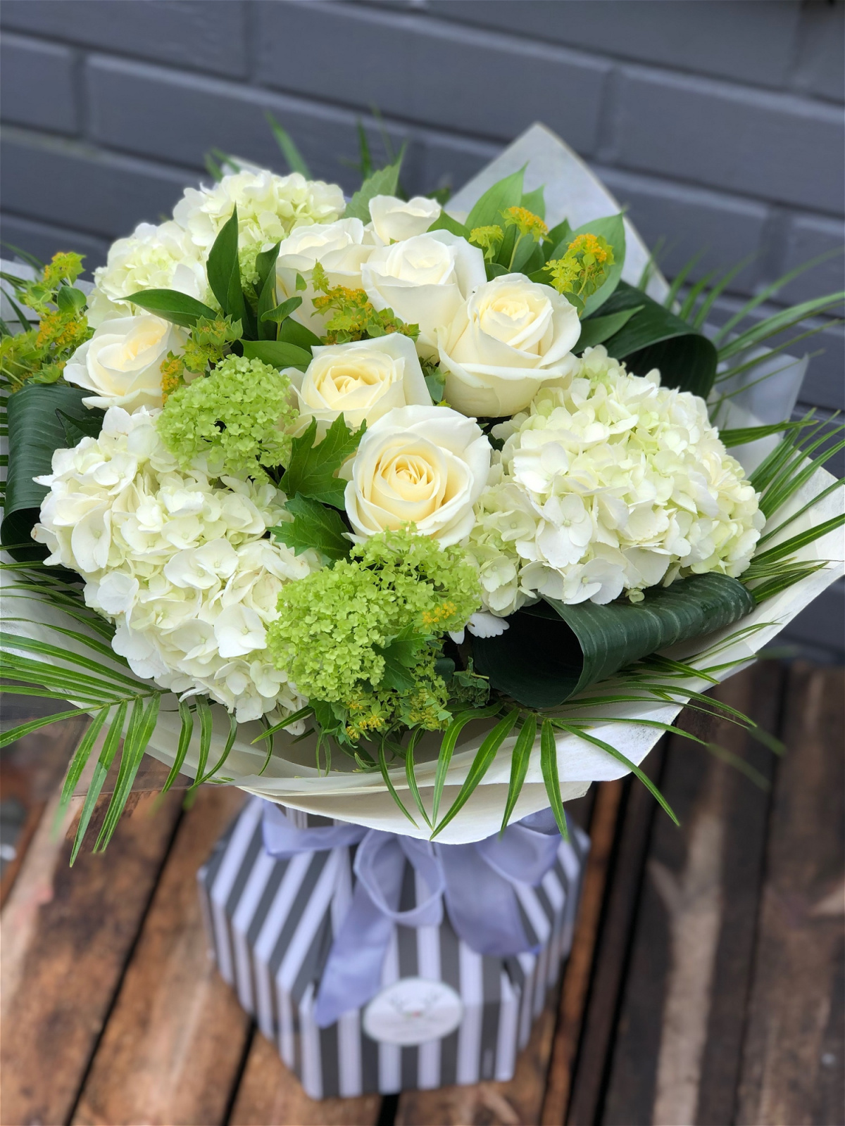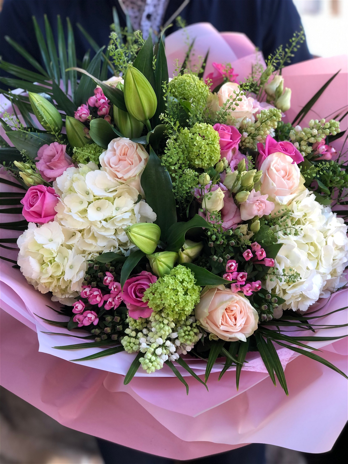 Vanilla Blues Delight is a mix of our signature floral choices, filled with divine heady hydrangea, luxury large headed roses along with seasonal specialties, This Handtied Bouquet of luxury blooms really is a feast for the senses.