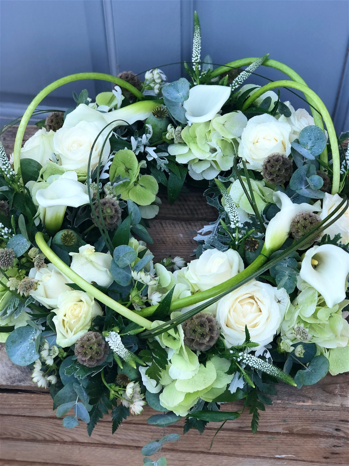 A modern twist to a traditional wreath. This wreath is based in all seasonal foliage's with clusters of Roses and looped Calla lilies. A gorgeous design certainly to make a heartfelt statement.