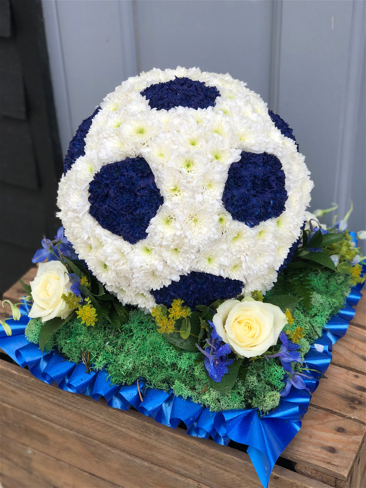 Based Chrysanthemum wreath in the shape of a football on turf.