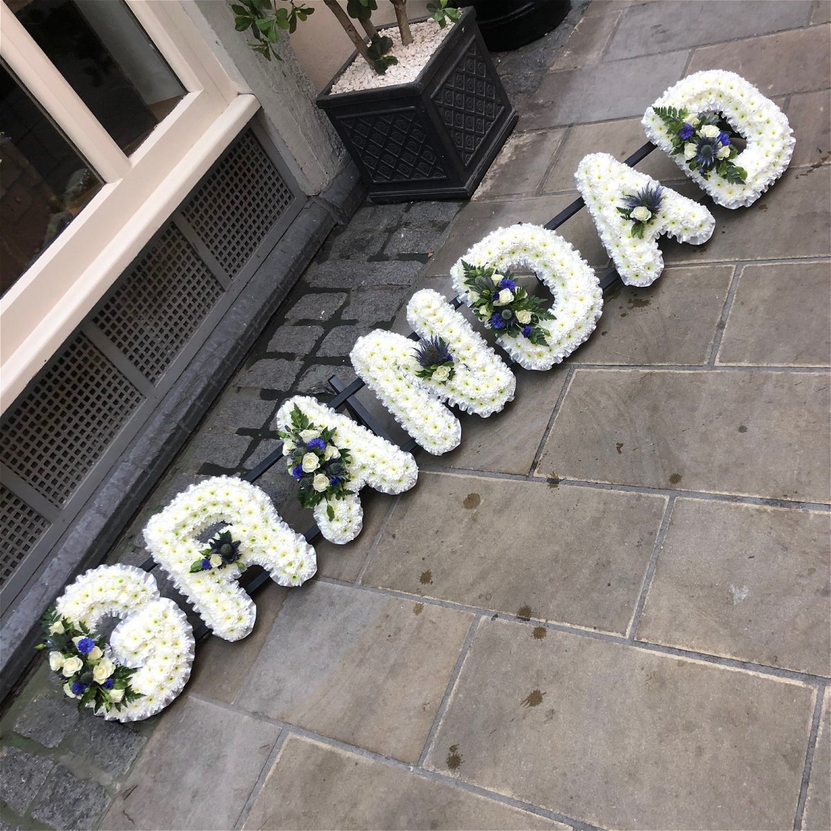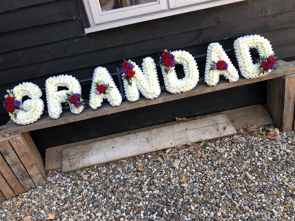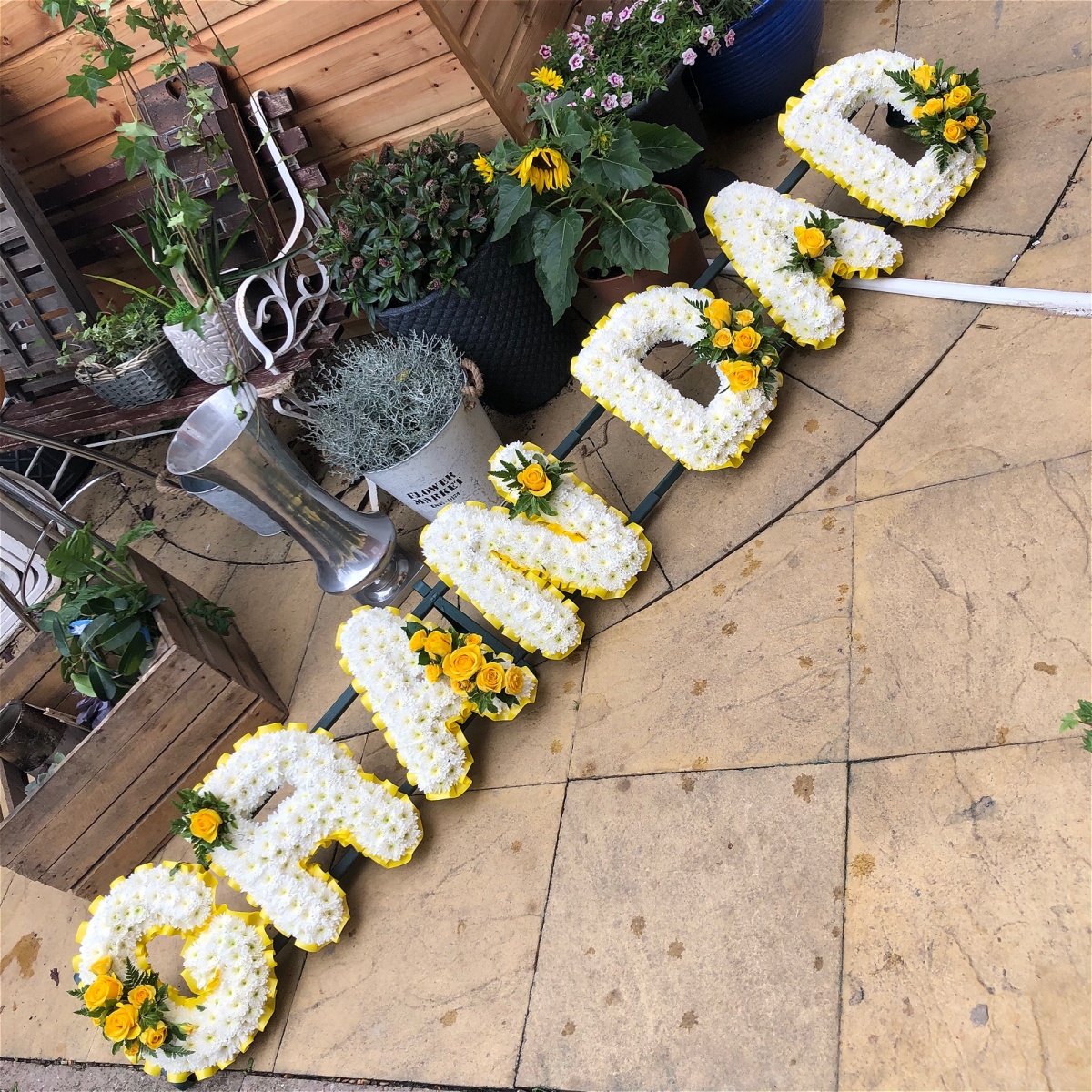 Each letter is based in Double Chrysanths and a single Rose is arranged onto each letter. Finished with a matching ribbon edge.