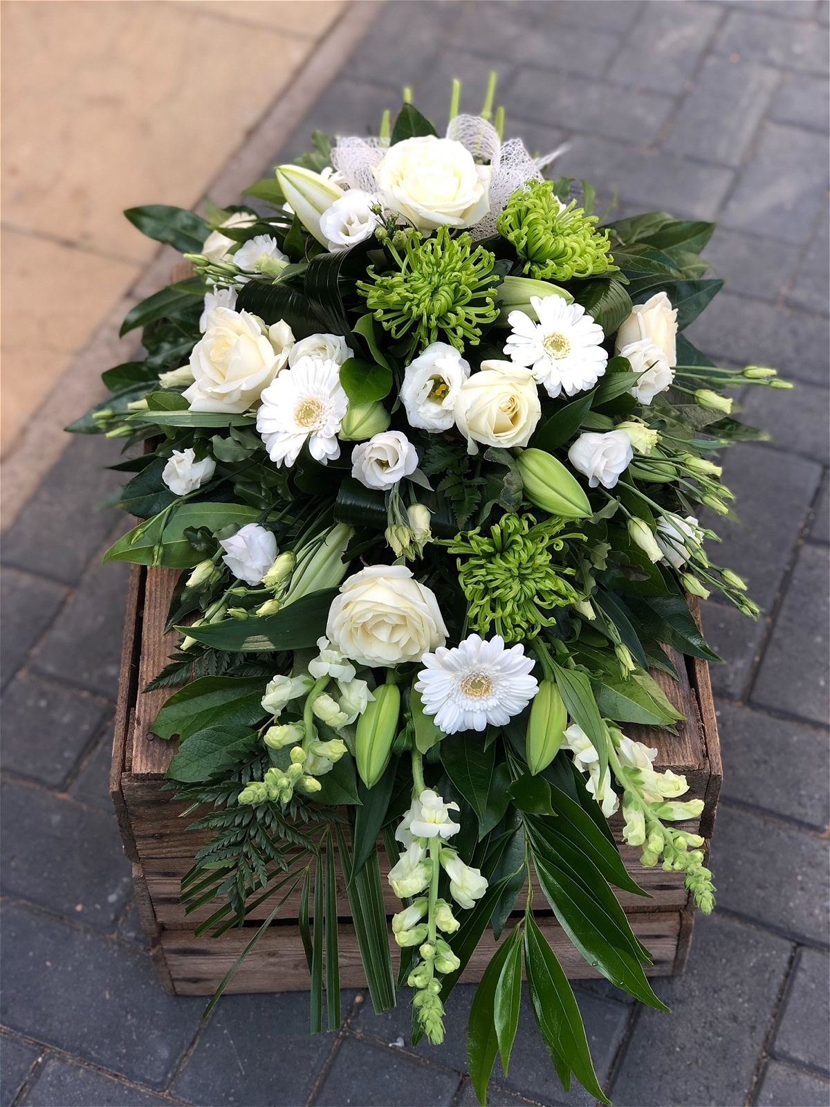 A beautiful green and white mixed sheaf. Lilys, Blooms, Roses and Eustomia sit perfectly alongside variegated lime Dracaena, Aralia leaves, Cocculus, Salal and Palm, finished with a rustic hessian bow.