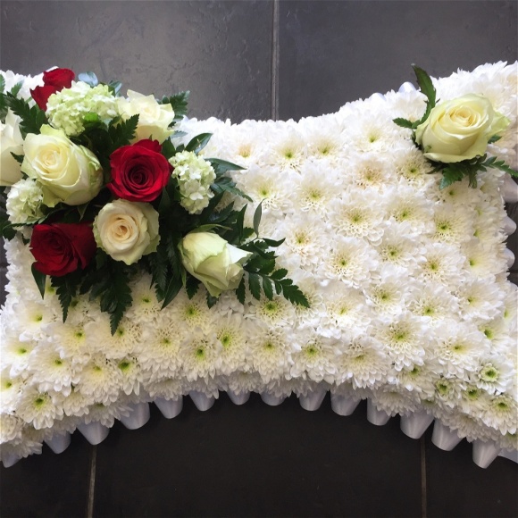 A beautiful Traditional Pillow based with Double Chrysanthemums and topped with a floral corsage sit perfectly on this timeless classic tribute, finished with a pleated ribbon edging.